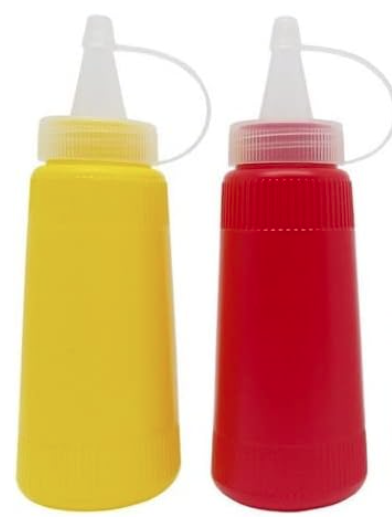 Frascos plásticos para condimentos, nas cores amarela e vermelha, ideais para armazenar e dispensar ketchup, mostarda, maionese e outros molhos. Com tampa de rosca e bico dosador, proporcionam praticidade e controle na aplicação dos condimentos, sendo perfeitos para uso em cozinhas, lanchonetes e eventos.