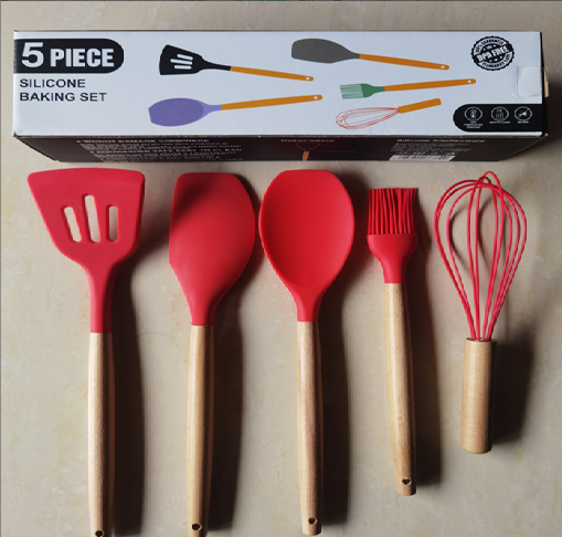 Conjunto de 5 peças de silicone, cabo de madeira