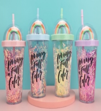 Copo de fio de ouro arco-íris de camada dupla + corpo do copo impresso como mostrado + palha combinando com a cor