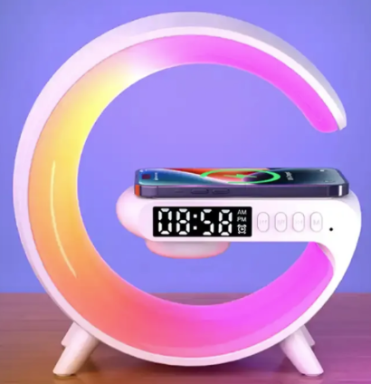 Alto-falante bluetooth para música e chamadas telefônicas; Carregamento rápido sem fio para smartphones; Controle de efeitos de iluminação Relógio despertador com luz que pode simular o nascer do sol; 7 modos de iluminação. Material: ABS, PC, metal