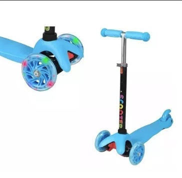 Patinete infantil de três rodas na cor azul, com guidão ajustável e base antiderrapante. Perfeito para proporcionar diversão e exercício físico para as crianças, garantindo segurança e estabilidade durante o uso.